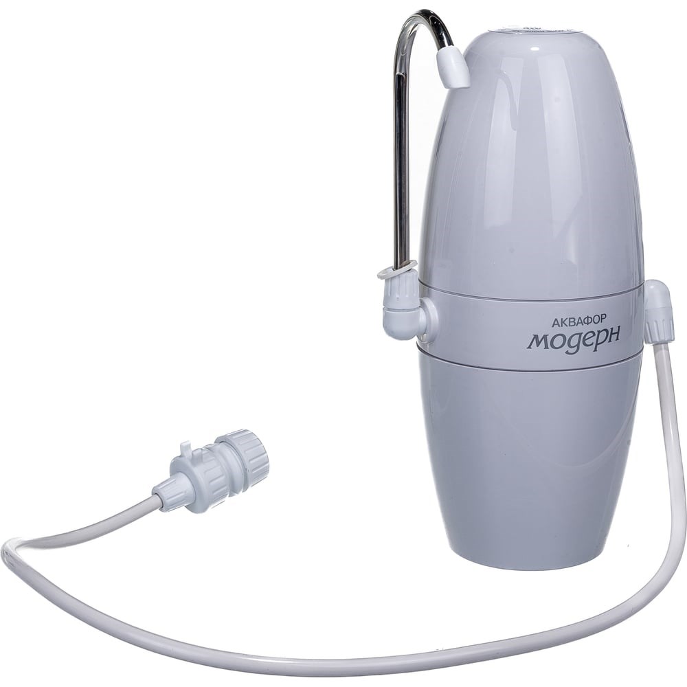 Многоступенчатый водоочиститель Аквафор Модерн 1 сочетает уникальные волокнистые и гранулированные сорбенты, которые глубоко очищают ее от органических соединений, тяжелых металлов, различных вредных примесей и препятствуют размножению бактерий. Приспособление имеет компактные размеры, устанавливается непосредственно на кран. Подключение может быть временным и постоянным за счет насадки с переключателем. Фильтр обладает большим рабочим ресурсом и производительностью. Он легко подключается к крану, излив из нержавеющей стали может поворачиваться в различных направлениях.
