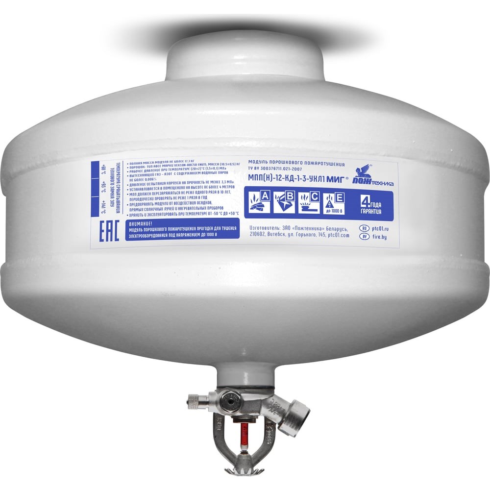 Модуль МИГ МПП-12/68БМИГ МПП-12/68Б: Автономное устройство для обнаружения и тушения пожаровМодуль МИГ МПП-12/68Б представляет собой эффективное устройство для автоматического обнаружения и тушения возгораний всех классов пожаров, включая электроустановки под напряжением до 1000 В. Он обеспечивает надежную защиту без участия человека благодаря встроенному тепловому замку, который активирует выброс огнетушащего порошка при достижении определенной температуры.Технические характеристики:Температура срабатывания: +68 °С Тип корпуса: Неразрушаемый (Н) Тип газа: Закачной (З), вытесняющий газ — осушенный азот Классификация по времени действия: КД-1 Перезарядка: Не реже одного раза в 10 лет Масса заряда: 10,5±0,3 кг Вместимость корпуса: 12 л Полная масса модуля: Не более 17,1 кг Высота крепления: 2,5-4 м Габариты: Высота 330 мм, диаметр 230 мм Рабочее давление: 1,5±0,1 МПа Температурный диапазон эксплуатации: от -50 до +50 °С Тип крепления: Потолочное