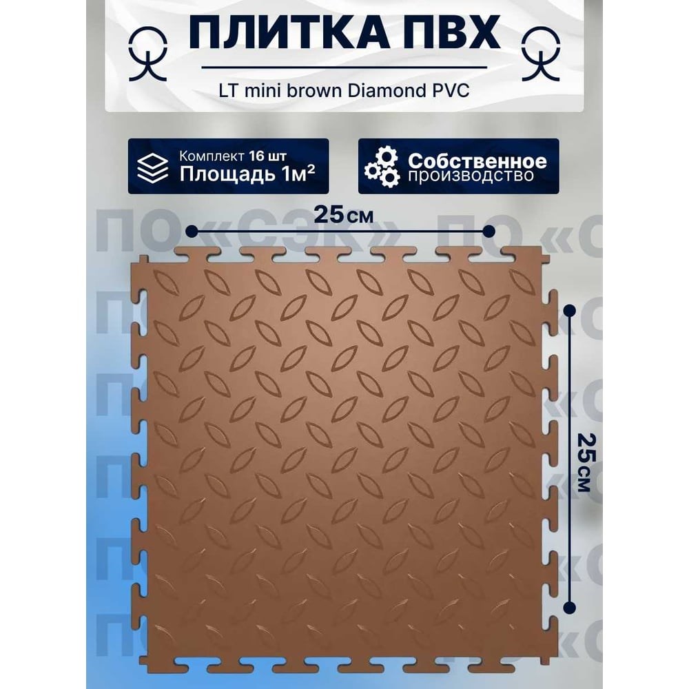 Ищете долговечное, стильное и практичное решение для вашего интерьера? Наше напольное покрытие ПВХ модульная плитка ПО СЭК, LT mini Diamond PVC, в 1 упаковке 16 плиток = 1м2, высокого качества идеально подходит для гаража, ванной комнаты, офиса, кухни, дорожки для дачи. Толщина плитки 5 мм, выдерживает до 20 тонн на 1 м2.Для правильной укладки плитки ПО СЭК необходимо соблюдать важные условия. Прежде всего, основание должно быть ровным, твердым и сухим. Кроме того, в некоторых случаях требуется дополнительное приклеивание покрытия к основанию, а именно: - при перемещении по поверхности тяжелой техники (рохли, кары, тележки); - при вероятности обильного проливания воды; - при установке системы теплого пола; - при значительных перепадах температур. Полы можно укладывать вручную, для укладки достаточно иметь деревянный молоток/киянку. Плитка имеет Т-образный замок, что обеспечивает более прочное крепление элементов.Уже сегодня приобретая нашу модульную плитку ПВХ, вы сможете преобразить с лёгкостью свой интерьер! Качество нашего товара подтверждено Сертификатом соответствия RU C-RU.ПБ68.В.01732/23 Перед монтажом ПВХ плитку необходимо занести в помещение за 48 часов до начала работ и распаковать. Особенно важно соблюдать данное правило в холодное время года. Температура в помещении должна быть не менее +15 градусов.