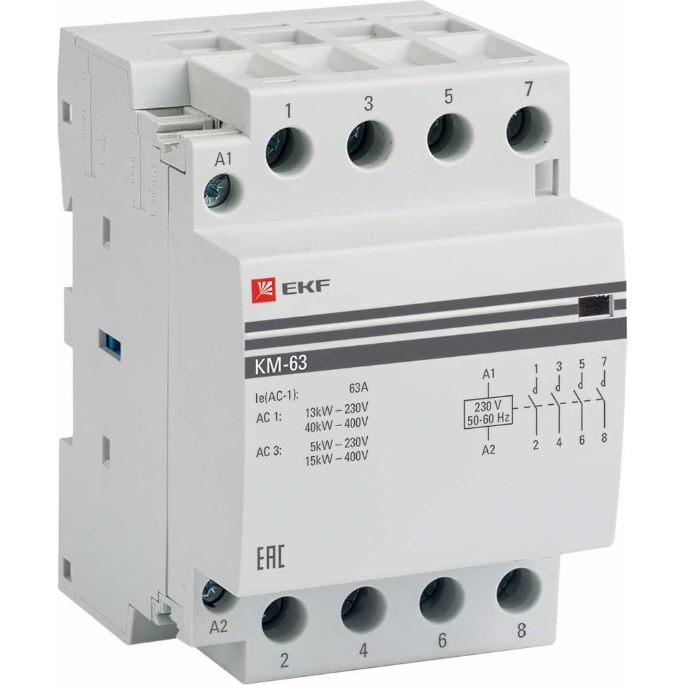 Модульный контактор EKF КМ, 63А 4NО (3 мод.) PROxima km-3-63-40 состоит из неподвижных контактов, подвижных контактов, которые закреплены в подвижной части магнитной системы. Неподвижная часть магнитной системы закреплена жестко в корпусе КМ. Пружина препятствует смыканию контактов. При подаче напряжения на катушку управления в магнитной системе контактора возникает магнитное поле, которое, преодолевая сопротивление пружины, смыкает магнитную систему и замыкает контакты. При отключении напряжения с катушки управления пружина размыкает контакты. Дополнительные характеристики: Номинальное рабочее напряжение, Ue, 230/400В. Номинальное импульсное напряжение Uimp, 6кВ. Номинальный условный ток короткого замыкания, 3 кА. Диапазон напряжения замыкания контактов, В От 195 до 253. Диапазон напряжения размыкания контактов, От 46 до 172В. Скорость срабатывания при замыкании, 20 мс. Скорость срабатывания при размыкании, 30 мс. Потребляемая мощность катушки управления, не более, 5 Вт. Механическая износостойкость 1 000 000, коммутационных циклов. Электрическая износостойкость, 150 000 коммутационных циклов. Высота над уровнем моря, не более, 2000 м. Исполнение: Стационарное. Рабочее положение в пространстве: Вертикальное. Группа механического исполнения по ГОСТ 17516.1: М3.