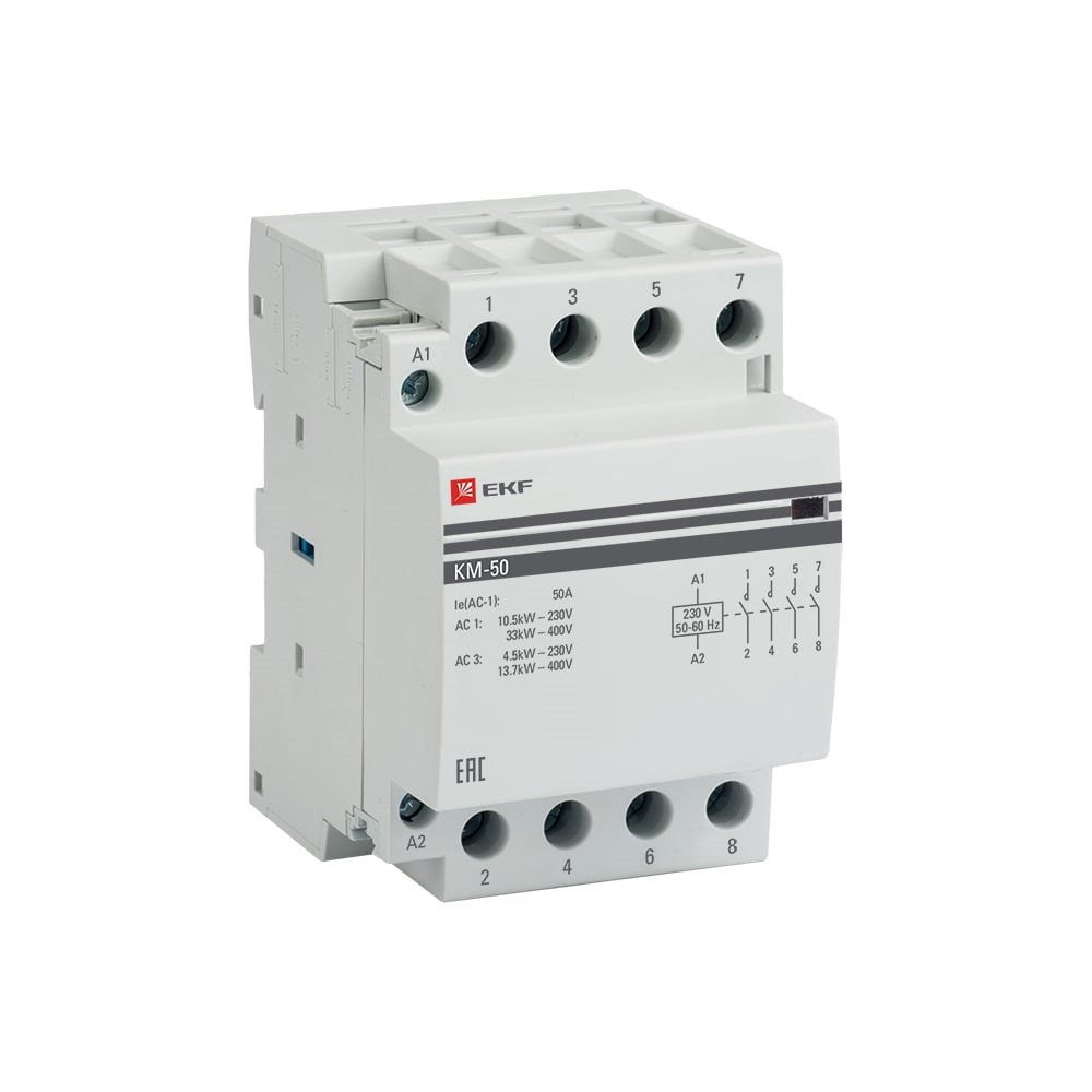 Модульный контактор EKF КМ, 50А 3п 220В 4но km-3-50-40 состоит из неподвижных контактов, подвижных контактов, которые закреплены в подвижной части магнитной системы. Неподвижная часть магнитной системы закреплена жестко в корпусе КМ. Пружина препятствует смыканию контактов. При подаче напряжения на катушку управления в магнитной системе контактора возникает магнитное поле, которое, преодолевая сопротивление пружины, смыкает магнитную систему и замыкает контакты. При отключении напряжения с катушки управления пружина размыкает контакты. Дополнительные характеристики: Номинальное импульсное напряжение Uimp, 6кВ. Номинальный условный ток короткого замыкания, 3 кА. Ток удержания катушки управления, мА 18 (КМ-16, КМ-20), 12 (все остальные). Диапазон напряжения замыкания контактов, В От 195 до 253. Диапазон напряжения размыкания контактов, От 46 до 172В. Скорость срабатывания при замыкании, 20 мс. Скорость срабатывания при размыкании, 30 мс. Потребляемая мощность катушки управления, не более, 5 Вт. Напряжение катушки управления, Uс, 230 B (AC). Механическая износостойкость 1 000 000, коммутационных циклов. Электрическая износостойкость, 150 000 коммутационных циклов. Высота над уровнем моря, не более, 2000 м. Исполнение: Стационарное. Рабочее положение в пространстве: Вертикальное. Группа механического исполнения по ГОСТ 17516.1: М3.