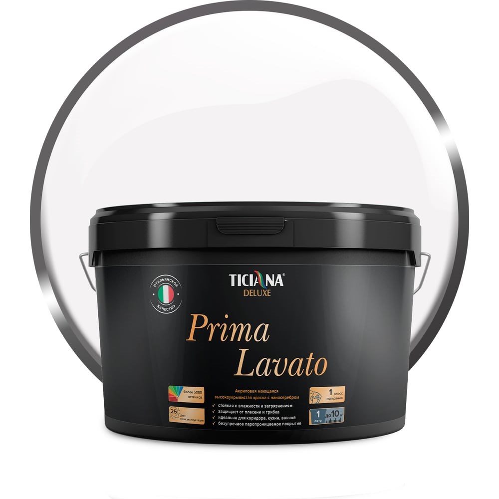 Моющаяся акриловая краска Ticiana DeLuxe высокоукрывистая с наносеребром, база А, 2.5 л 4300008528 - это особо прочная краска на основе акриловой дисперсии для высококачественной отделки стен и потолков внутри помещения, а также для окрашивания фасадов зданий и сооружений. Продукт предназначен для обработки бетонных, оштукатуренных, гипсокартонных, кирпичных и других минеральных поверхностей в жилых и общественных помещениях. Подходит для объектов с высокой эксплуатационной нагрузкой и повышенной влажностью. Компьютерная колеровка машинным способом или вручную универсальными колерами Ticiana Mix позволяет получить любой желаемый оттенок. Состав равномерно распределяется по основанию при помощи кисти, валик или краскораспылителя и образует белую полуматовую поверхность. Внимание! Фото может отличаться от товара, при выборе ориентируйтесь на технические характеристики.