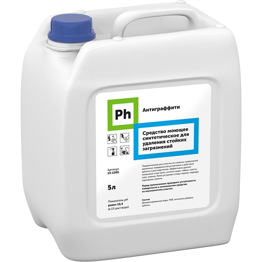 Ph Средство для удаления стойких загрязнений, Антиграффити - щелочное средство, предназначеное для очистки от сложных загрязнений различных поверхностей, устойчивых к действию щелочи и растворителей. Эффективно удаляет въевшиеся слои грязи, остатки жира, табака, скотча, клея, жвачки. Легко устраняет следы чернил, маркера, карандаша, резины. Перед применением проверить устойчивость поверхности к компонентам средства на малозаметном участке.Область применения: образовательные учреждения, лечебно-профилактические учреждения, объекты общественного питания, предприятия ЖКХ, в быту.Меры предосторожности: Средство содержит щелочь и растворители! Не употреблять в пищу. Не смешивать с другими чистящими и моющими средствами. Использовать перчатки. При попадании на кожу или в глаза промыть большим количеством воды, при необходимости обратится к врачу.Хранение и транспортировка: Хранить в местах, недоступных для детей, отдельно от пищевых продуктов и лекарственных средств, вдали от источников тепла. Хранить при температуре от -5°C до 30°C, после оттаивания сохраняет свои свойства. Перевозится всеми видами транспорта. Средство не является опасным грузом.Продукт разработан для профессионального применения. Компания-производитель не несет ответственности за неправильное использование и хранение средства.