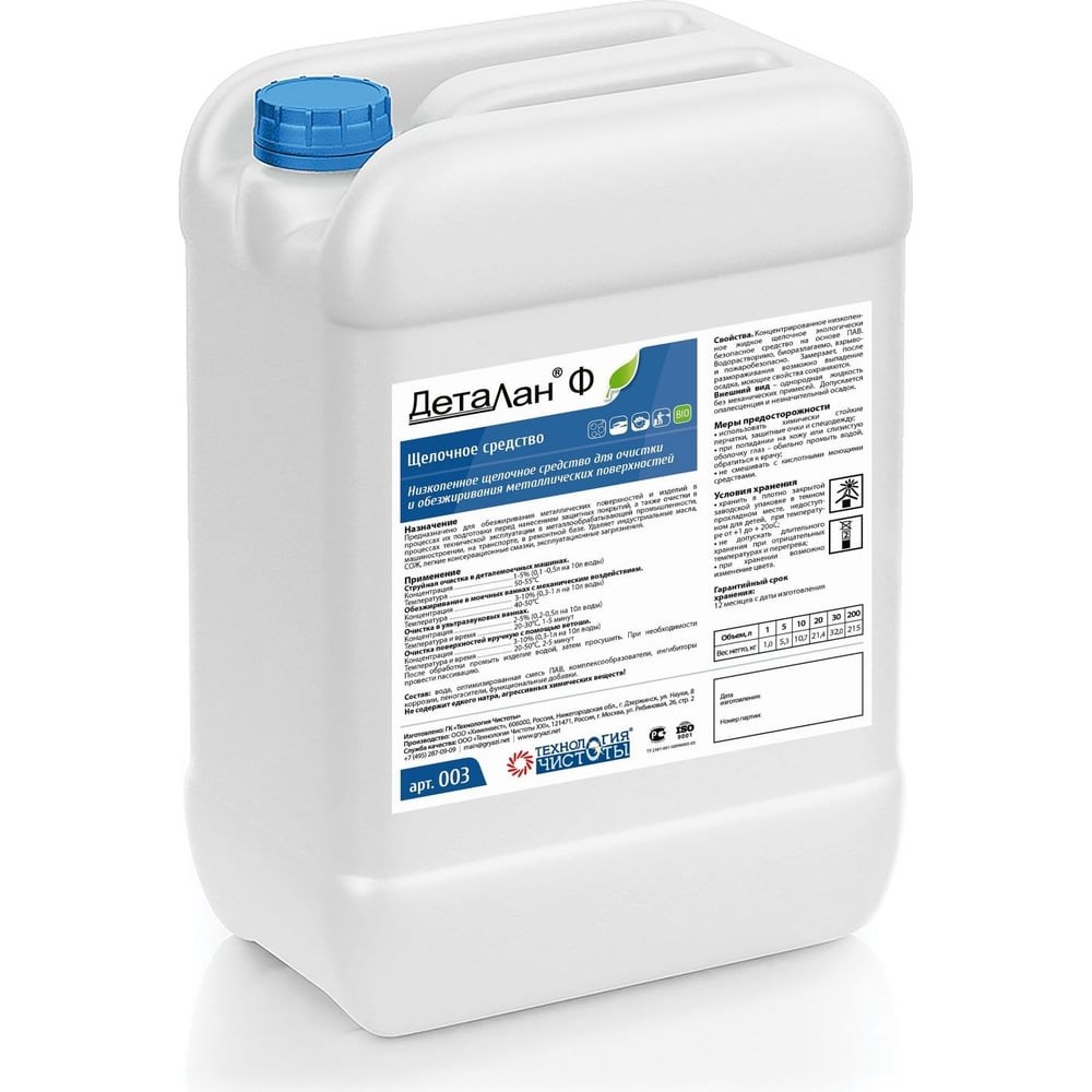 Моющее средство для деталей технология чистоты Ф 10 л 003.10 - концентрированное низкопенное жидкое щелочное экологически безопасное средство на основе ПАВ предназначено для обезжиривания любых металлических поверхностей и изделий в процессах подготовки перед нанесением защитных и технической эксплуатации в металлоперерабатывающей промышленности, машиностроении, на транспорте, в ремонтной базе. Удаляет индустриальные масла, СОЖ, легкие конструкционные смазки, эксплуатационные загрязнения. Обладает хорошими обезжиривающими свойствами, эффективно работает в воде любой жесткости и температуры. Используется многократно с корректировкой рабочего раствора. Обладает пеногасящими свойствами, эффективно для струйной очистки. Не оказывает воздействия на любые щелочестойкие поверхности, не вызывает травления металлов, не разрушает резиновые и неметаллические поверхности. Экологически безопасно, биоразлагаемо.