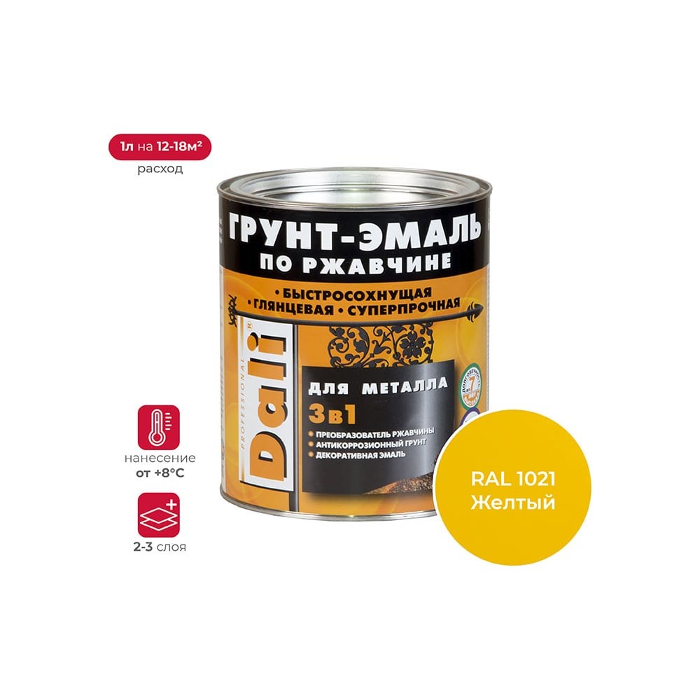 - Поверхностям из оцинкованного металла (профнастил) и нержавеющей стали.Грунт- эмаль по ржавчине 3в1 Dali - гладкая краска по ржавчине для металлических поверхностей.Допускается нанесение на деревянные поверхности влажностью не выше 20%, эксплуатируемые внутри помещений.Предназначена для защитно-декоративной обработки различных металлических поверхностей, в том числе пораженных точечной или сплошной коррозией c толщиной ржавчины до 100 мкм.Применяется внутри и снаружи помещений по любым металлическим поверхностям, новым и ранее окрашенным: - Стальным и чугунным (решетки, ограды, гаражи, ворота и пр.); - Цветным металлам (цинк, медь, алюминий); Состав: модифицированная алкидная смола, восстановитель металла, ингибитор коррозии, пигменты, наполнитель, антикоррозионные и функциональные добавки, растворитель; Разбавление: допускается, но не более 10% от общей массы состава; Разбавитель: универсальный растворитель Dali™, уайт-спирит, сольвент, ксилол, Р 646/647; Температура применения: от +8 °С; Количество слоев: 2 - 3; Расход в 1 слой 1 л: 12 - 18 м²; Высыхание на «отлип»: 3 ч; Межслойная сушка: от 5 мин до 3 ч; Полное высыхание: 3 ч; Степень блеска: глянцевая; Вязкость: ВЗ-246 6мм при t° +20 ± 2 °C 40 - 80 сек; Плотность: 1,2 - 1,3 г/см³; Стойкость пленки: к статическому воздействию масел, воды, 3% раствора NaCL до 7 суток; Термостойкость: до + 80 °С; Цвет: RAL 1021, желтый.