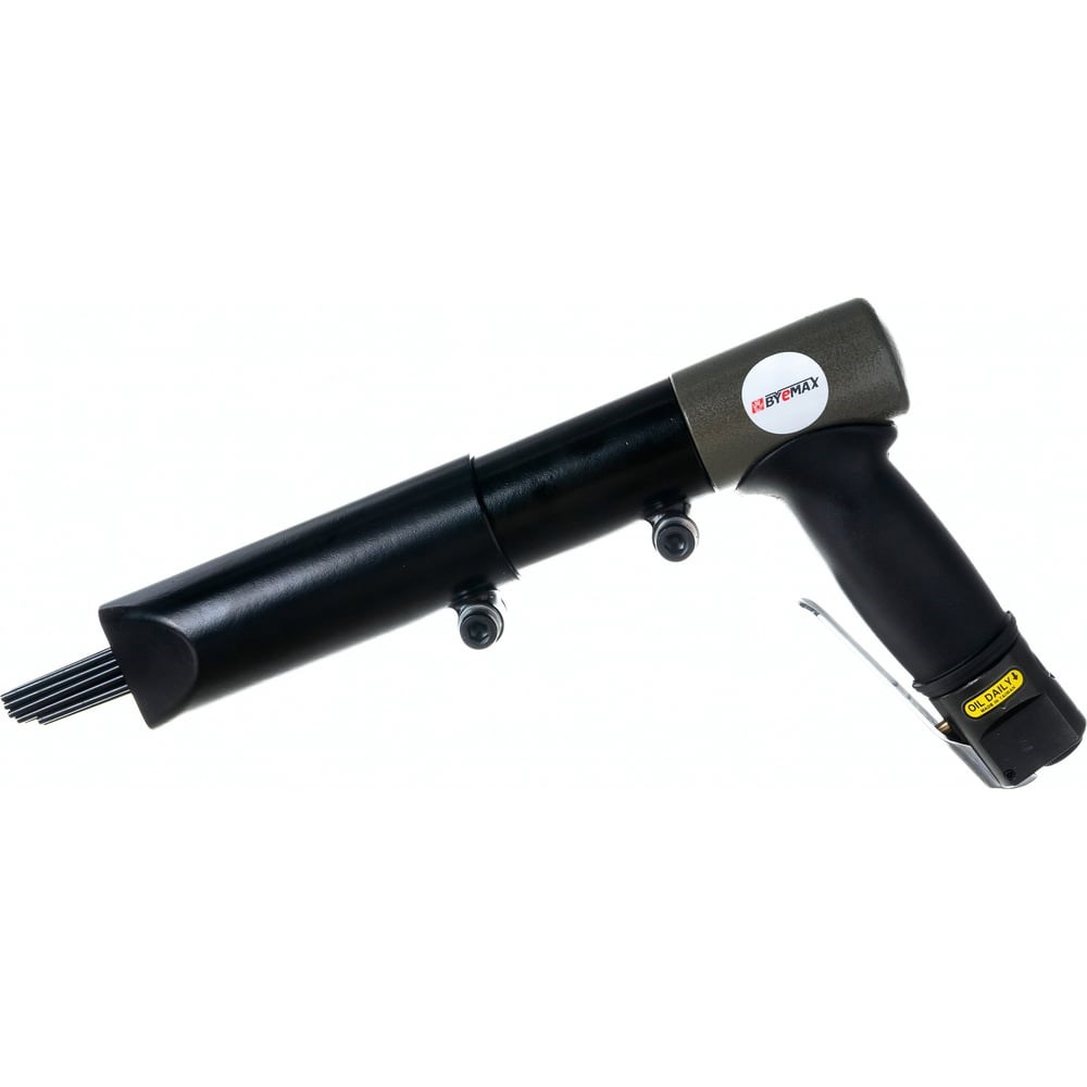 Пневмомолоток BYEMAX BG-2110NS с пистолетной рукояткой обеспечивает удобный хват. Инструмент предназначен для обдирки и зачистки твердых поверхностей (металла, камня) от ржавчины, старой краски, окалины, сварных брызг и других сильных загрязнений. Также может применяться в узкоспециализированных целях, например для придания шероховатости поверхности металла. В качестве рабочего инструмента используется пучок игл разного диаметра, обеспечивающего особую эффективность при обработке в углах или неровных поверхностях.
