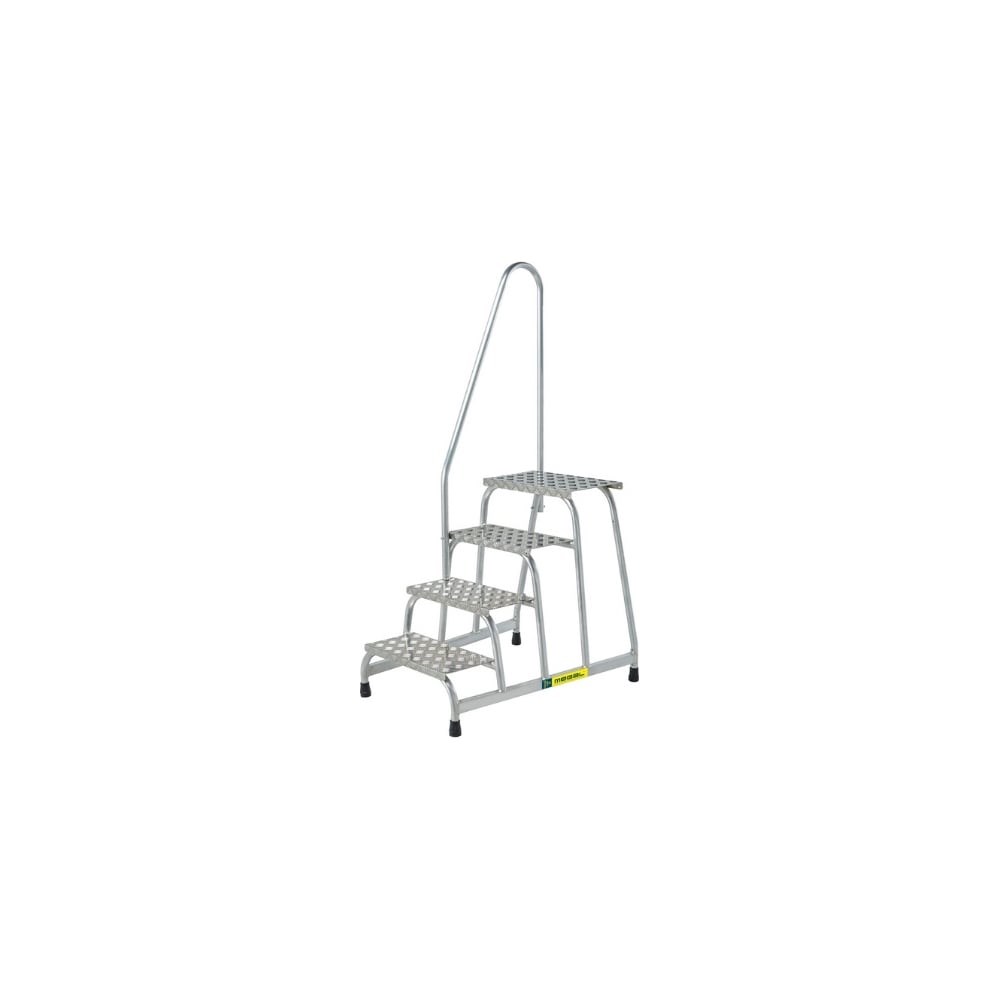 Монтажная подставка с одним поручнем MEGAL тип 1, 4 ступени 050304 применяется для работы на небольшой высоте. Изготовлена из алюминия, который отличается прочностью, небольшим весом и устойчивостью к воздействию коррозии. Безопасность. Предусмотрены широкие ступени с рифленым покрытием и поручень для безопасного подъема и спуска. Резиновые башмаки на ножках гарантируют устойчивость подставки.