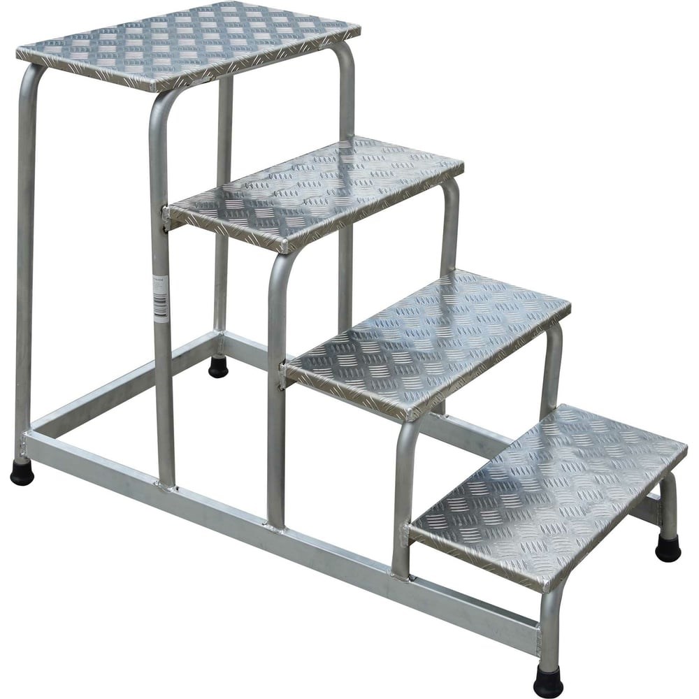 Монтажная подставка Новая Высота NV 3710, 1х4 ступени 3710104 предназначена для монтажных работ и технического обслуживания. Изготовлена из прочных алюминиевых труб, устойчивых к коррозии и деформации. Верхняя площадка размером 520х305 мм обеспечивает удобную работу на высоте. На опорах предусмотрены наконечники, которые предотвращают скольжение по полу.