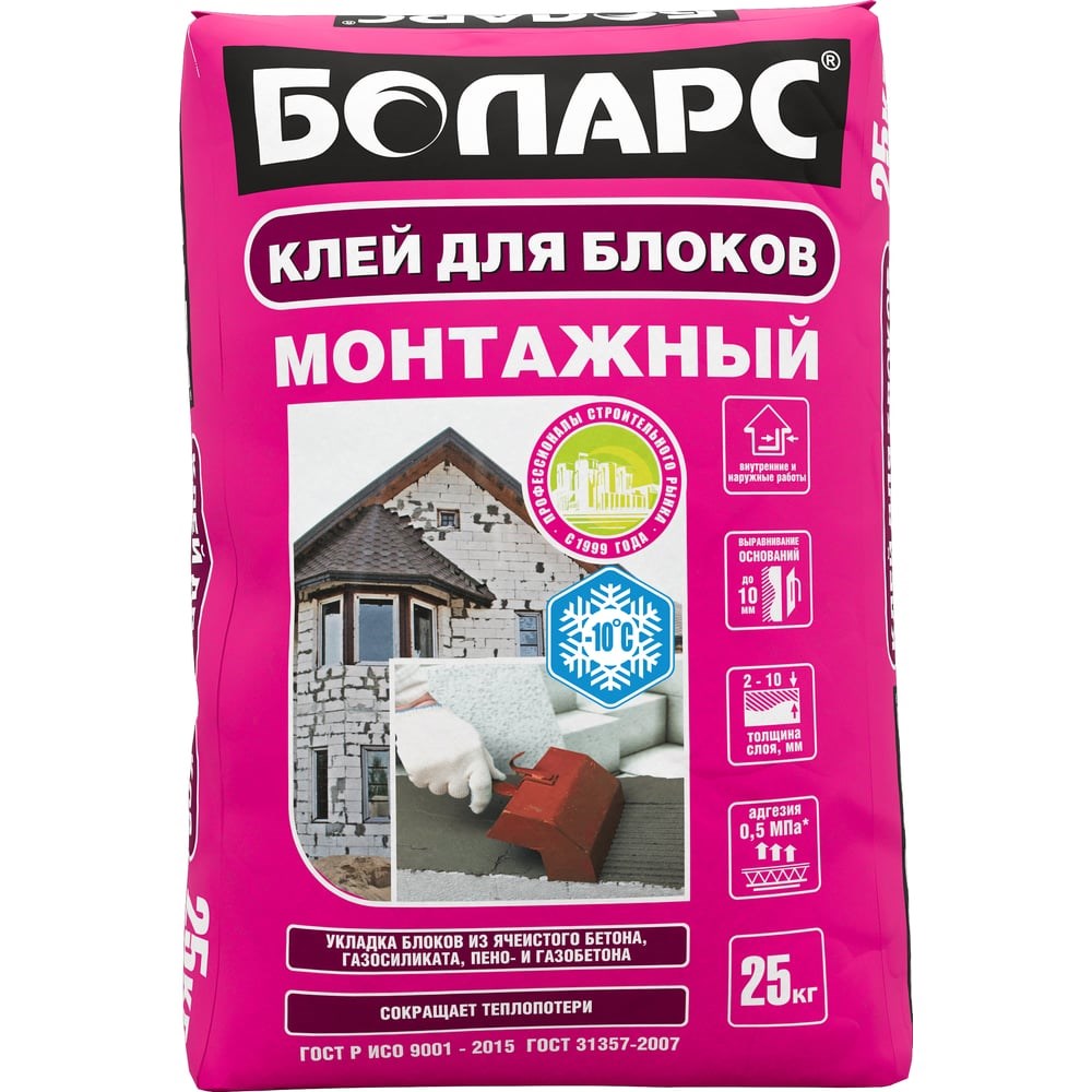 Монтажный клей БОЛАРС морозостойкий, 25 кг 00000003729 применяется для укладки блоков и плит из ячеистых бетонов (пено- и газобетона), газосиликата, полистиролбетона и силикатного кирпича при отрицательных температурах (до -10 градусов). Благодаря тонкослойному нанесению, от 2 мм, препятствует образованию "мостиков холода" в кладочных швах, что позволяет значительно сократить теплопотери. Может использоваться для базового выравнивания поверхностей слоем до 10 мм. Предназначен для нанесения ручным способом при наружных и внутренних работах. Изготовлен на цементной основе с использованием высокоэффективных полимерных модифицирующих добавок.