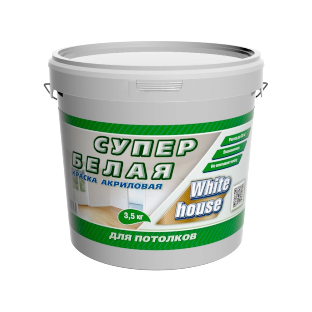 Краска для потолков White House (3.5 кг; морозоустойчивая) 13616 краска для потолка супербелая WHITE HOUSE - надежная и долговечная водно-дисперсионная акриловая краска для внутренних работ . После высыхания образует долговечное матовое покрытие с высокой белизной, стойкое к сухому истиранию. Краска для потолка без запаха и быстро сохнет, а следовательно обеспечит Вам идеальные условия для окрашивания и позволит сберечь Ваше время. Не мелит, позволяет поверхности "дышать". Акриловая краска белая экономно расходуется, так как обладает отличной укрывистостью, закрашивает поверхность всего в 1-2 слоя и сразу придаёт ей белоснежный насыщенный цвет. Еще одно важное преимущество краски то, что она допускает дальнейшее перекрашивание без смывания предыдущего слоя и Вам не нужно будет заботиться о выборе смывочных материалов. Применяйте краску для потолка на различных материалах в качестве краски по дереву , краски по бетону , краски по кирпичу , краски по гипсокартону , краски по штукатурке , краски по камню и краски по обоям . Перед нанесением краски для внутренних работ рекомендуем предварительно загрунтовать поверхность.
