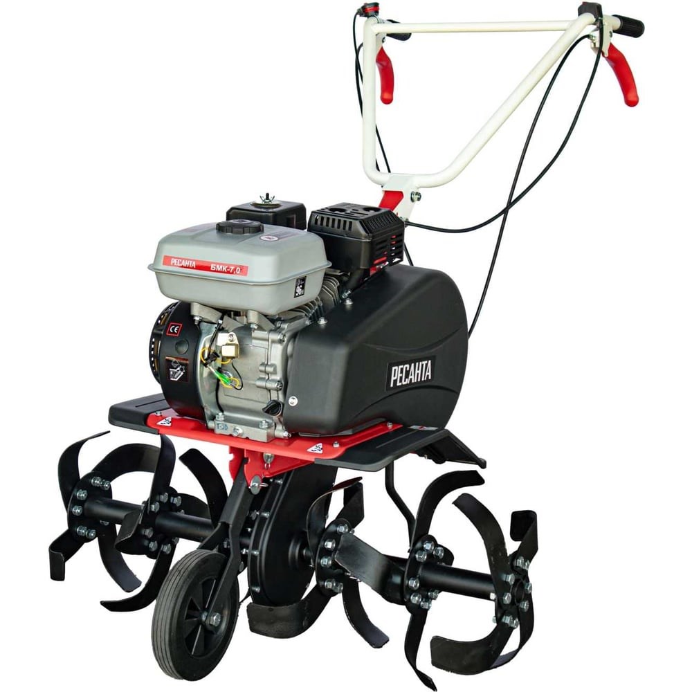 Садовый культиватор средней мощностиРесанта БМК-7,0предназначен для продолжительной непрерывной работы по обработке почвы на больших участках. Обработка почвы рыхлением осуществляется роторными сборными фрезами, которые входят в комплект поставки мотокультиватора. Диаметр фрез: 30 см. Мощный (7 л.с.), одноцилиндровый 4-х тактный бензиновый ДВС с воздушным охлаждением позволяет обрабатывать полосу 90 см за один проход, используя весь комплект фрез. Двигатель оснащен датчиком критического уровня масла, который блокирует работу ДВС при снижении уровня необходимого для качественной смазки движущихся частей внутри картера. Крутящий момент передается через клиноременную передачу от двигателя на цепной редуктор. На выходной сквозной вал редуктора симметрично устанавливаются роторные фрезы или другой навесной инструмент.Основные органы управления режимом работы мотокультиватора выведены на рулевую дугу и состоят из:ручки сцепления движения вперед;ручки сцепления движения назад;рычага газа.Кроме того, на корпусе ДВС установлен выключатель зажигания, для остановки двигателя.Основными отличительными особенностями культиватора Ресанта БМК-7,0 можно считать:наличие заднего хода облегчает извлечение агрегата из земли;убирающееся перекатное колесо упрощает перемещение агрегата по участку;автоматическая регулировка оборотов двигателя в зависимости от нагрузки на фрезы;хромовое покрытие поршневой группы обеспечивает ее износостойкость;двигатель имеет повышенную гарантию – 3 года.