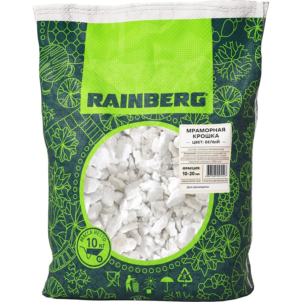 Название продукта: Rainberg Мраморная крошка белаяТип фракции: 10-20 ммОбъем упаковки: 10 кгОсобенности продукта:Натуральная мраморная крошка белого цвета придаёт вашим проектам уникальный вид и улучшает качество поверхностей.Универсальна для декоративного и строительного применения.Используется в ландшафтном дизайне, отделке фасадов зданий, создании садовых дорожек и оформлении территорий.Для кого подойдёт:Дизайнеры интерьеров и экстерьеров.Владельцы частных домов и дач.Строительные бригады и специалисты по ремонту помещений.Основные преимущества:Высокое качество сырья обеспечивает долговечность покрытия.Удобство транспортировки благодаря компактному весу упаковки.Идеально сочетается с различными строительными смесями и растворами.Экологичность: Продукт изготовлен из натурального камня, безопасен для здоровья и окружающей среды.Приобретайте мраморную крошку бренда Rainberg и создавайте долговечные и привлекательные проекты!