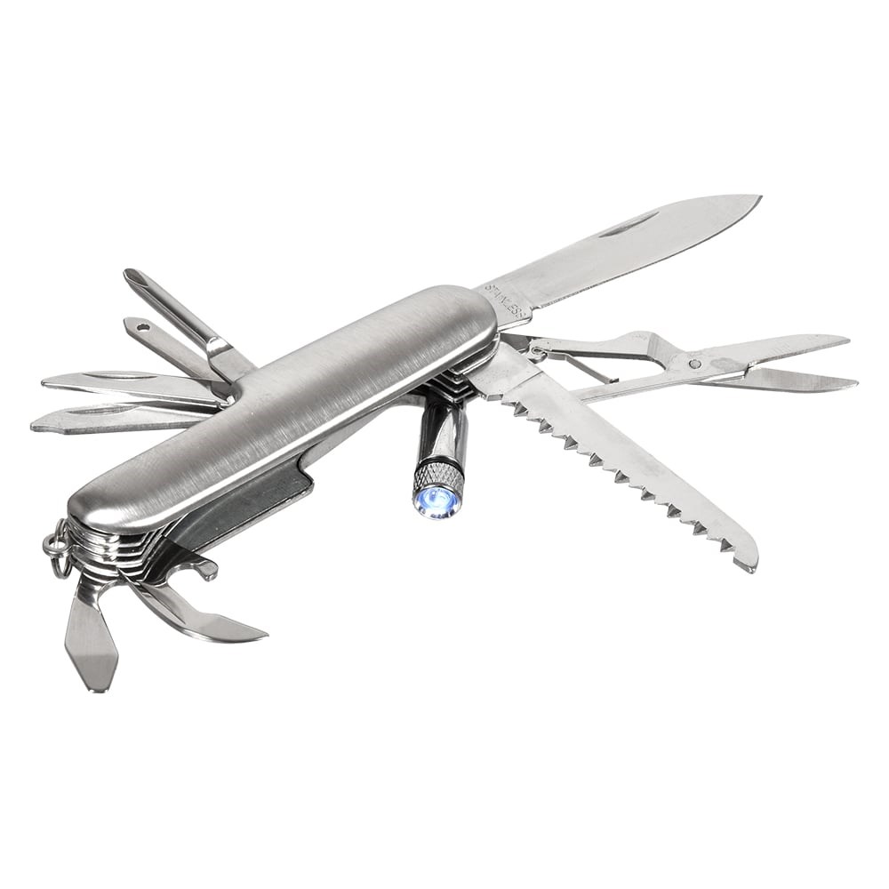 Мультиинструмент BOYSCOUT Универсал 61285 пригодится в быту или на отдыхе. Он изготовлен из нержавеющей стали, благодаря чему прослужит долгий срок. Все рабочие части аккуратно складываются в корпус для удобного хранения. Мультиинструмент содержит 14 функций: нож, пила по дереву, ножницы, консервный нож, открывалка для бутылок, плоская отвертка, штопор, крестовая отвертка, шило, резак, проколка, пилочка и лопаточка для ногтей, кольцо для ключей, светодиодный фонарик.