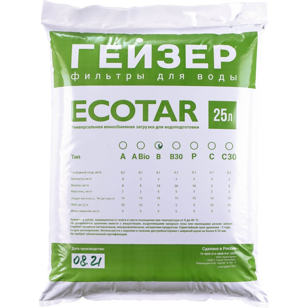 Экотар B – универсальная ионообменная загрузка для водоподготовки.Рекомендуется для очистки воды из артезианских скважин от растворенного железа (до 15 мг/л), марганца и солей жесткости при незначительном содержании органических веществ.Визуальная оценка исходной воды: первоначально прозрачная, при отстаивании желтеет и даёт бурый осадок.Возможна регенерация загрузки с использованием раствора поваренной соли.Максимальная рабочая температура: 40°C. Объем 25 литров.Условия применения:Железо: до 15 мг/л;Марганец: до 5 мг/л;Жёсткость: до 15 мг/л;ПМО: до 5 мг О2/л;Активный хлор: до 0,1 мг/л;Сероводород: полное отсутствие;Нефтепродукты: полное отсутствие;