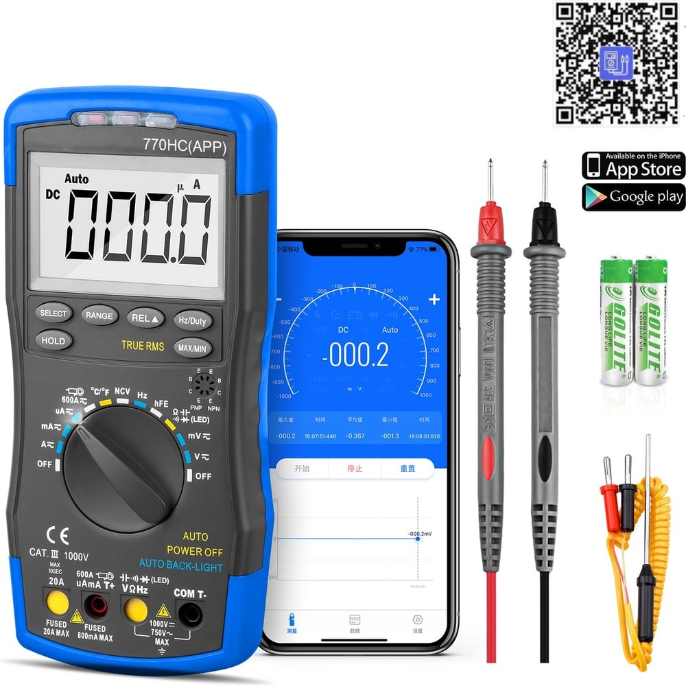HoldPeak HP‑770HC-APP — профессиональный цифровой мультиметр с True RMS и автоматическим выбором диапазона, обеспечивающий точные измерения для промышленности, электроники и сервисных работ. Оснащён Bluetooth для подключения к мобильному приложению, функцией NCV, прозвонкой, диод-тестом и подсветкой дисплея. Разрядность 6000, компактный и лёгкий корпус, автоотключение для экономии энергии. Надёжный и удобный инструмент для быстрого и точного контроля электрических параметров. Области применения: Промышленность Электроника Энергетика Сервисные и ремонтные работы Образовательные учреждения