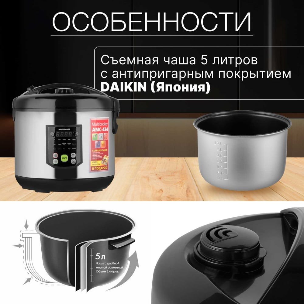Мультиварка NORMANN AMC-434 предназначена для бытового использования. Имеет 15 автоматических программ, что облегчает процесс готовки. Выполнена из нержавеющей стали и прочного пластика, благодаря чему мультиварка устойчива к износу. За счет гладкой поверхности легко моется.