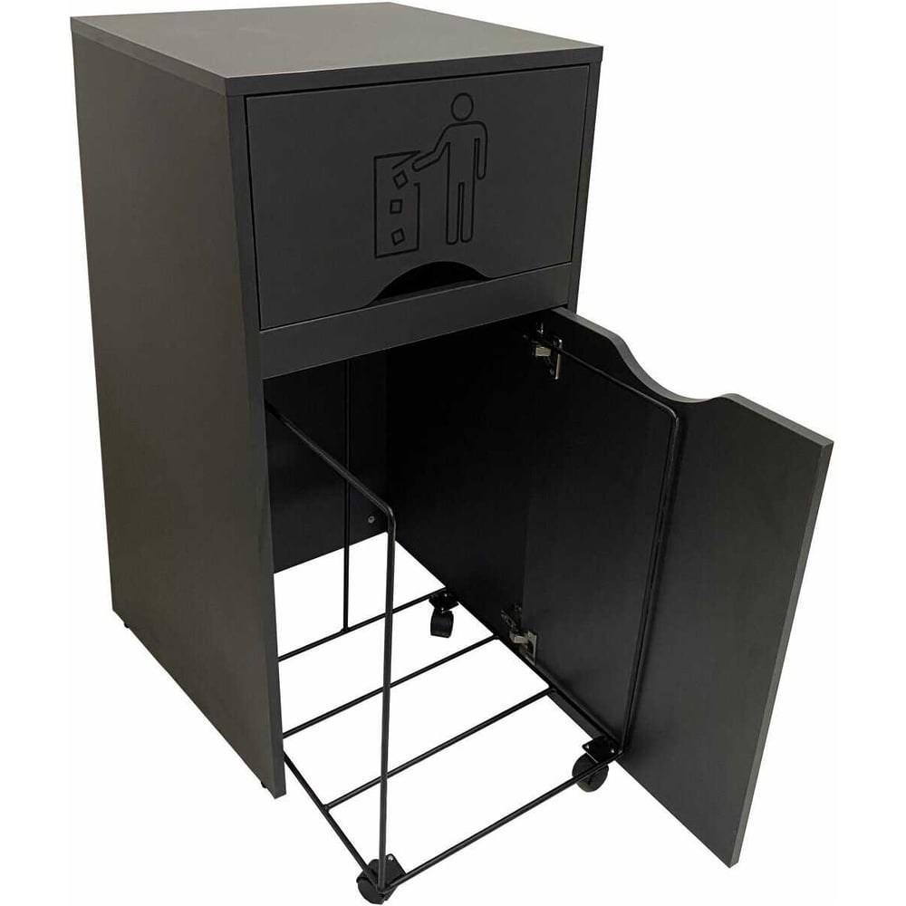 Контейнер для мусора (урна для фудкорта) Оди 1000 в виде тумбы с верхней подвижной створкой – это не только привлекательный дизайн, но и эффективное решение мусорного вопроса общественных заведений, таких как офисы, кафе, магазины, фудкорты ТЦ, салоны красоты, кофейни, бары, компьютерные клубы и пр. Продуманная закрытая конструкция препятствует проникновению неприятных запахов и сохраняет эстетичный внешний вид помещения. Благодаря качественному материалу ЛДСП, компактным размерам 1000х500х500 мм и различному цветовому исполнению, контейнер уютно вписывается в любой интерьер. Для удобства смены мусорных мешков внутри контейнера предусмотрена мобильная металлическая тележка. Способ открывания - нажатие на крышку Оснащение - колеса, дверка-маятник, стойка-держатель для мусорного пакет