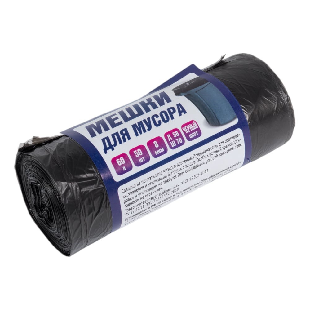 Мусорные пакеты обладают высокой прочностью и эластичностью, предназначены для сбора, хранения и транспортировки бытовых и производственных отходов. Мешки для мусора используются также при перевозке и ремонтах для транспортировки и хранения вещей, в том числе габаритных. - ПНД (полиэтилен низкого давления) - объем 60л - размер мешка 58х70см - плотность 8мкм - 50шт в рулоне - черные