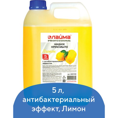 Мыло-крем жидкое 5 л, ЛАЙМА PROFESSIONAL "Лимон", с антибактериальным эффектом, 600190