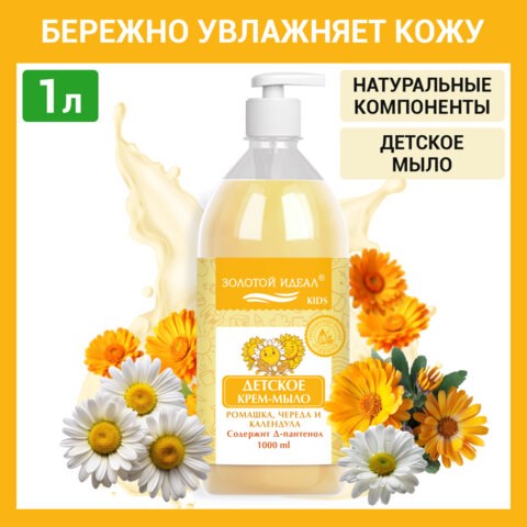 Мыло-крем жидкое гипоаллергенное 1 л, ЗОЛОТОЙ ИДЕАЛ KIDS "Ромашка, череда и календула", дозатор, 609430