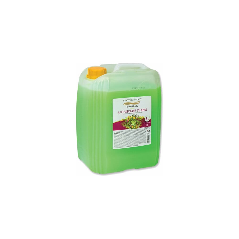 Жидкое мыло ЗОЛОТОЙ ИДЕАЛ идеально подходит для использования в офисах, отелях, ресторанах и других общественных местах. Средство универсального применения отлично очищает и смягчает кожу, обеспечивает уход и увлажнение, обладает приятным ароматом. Подходит для всех типов кожи и не содержит формальдегида. Легко очищает, ухаживает и увлажняет, равномерно распределяется по коже и легко смывается водой, даря удовольствие всей семье. Благодаря входящим в состав смягчающим компонентам сохраняет защитные функции кожи, не вызывая сухости и раздражения. Объем - 5 л. Способ применения: небольшое количество мыла нанести на влажную кожу, взбить пену и смыть её водой. Меры предосторожности: Использовать только по назначению! Хранить в недоступном для детей месте. При попадании мыла в глаза немедленно промыть их чистой водой. Соответствует ГОСТ 31696-2012. Срок годности: 24 месяца. Состав: Aqua, Sodium Chloride, Sodium Laureth Sulfate, Cocamide DEA, Styrene/Acrylates Copolymer, Parfum, DMDM Hydantoin, Methylchloroisothiazolinone, Methylisothiazolinone, C.I. 19140, C.I. 42090. • Объем / Вес: 5000 мл/г. • Мыло-крем: да. • Подходящий тип кожи: для всех типов. • Эффект от использования: очищение, увлажнение. • Серия: SOAP. • Отдушка: травы. • Сбалансированный уровень рН: да. • Тип дозирования: нет. • Вид упаковки: канистра. • Цвет: зелёный. • Артикул производителя: 606417.