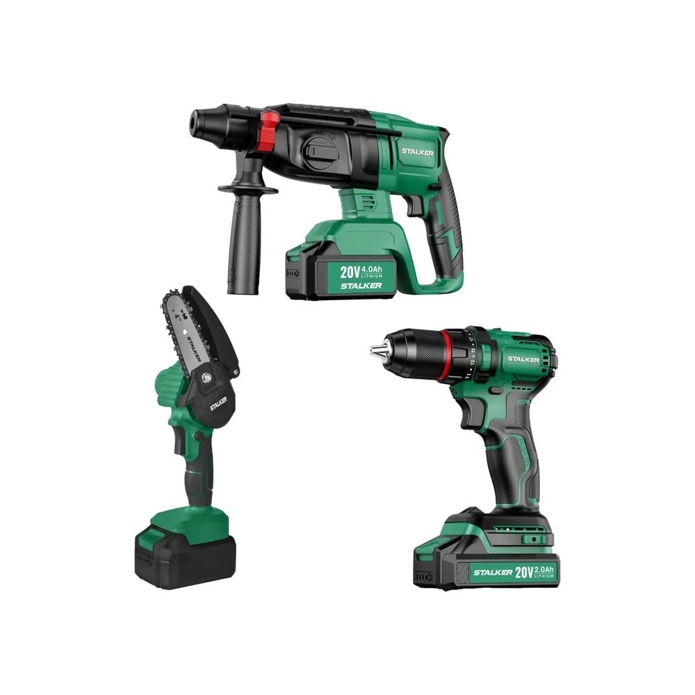 Бесщеточная аккумуляторная дрель-шуруповерт STALKER D20 Li-применяется для создания отверстий и закручивания крепежей при работе с деревянными, металлическими и пластиковыми конструкциями. Бесщеточный тип двигателя обеспечивает высокую производительность и долгий срок службы. Благодаря быстрозажимному патрону обеспечивается удобная замена и надежное крепление оснастки. Регулируемая скорость помогает подобрать оптимальный режим в зависимости от задачи. Дрель-шуруповерт оснащен удобной прорезиненной рукояткой.Бесщеточный аккумуляторный перфоратор STALKER RH20 Li BL- предназначен для сверления отверстий в различных материалах: дерево, сталь, бетон, кирпич и т.д. Имеет 3 режима работы: сверление, сверление с ударом, долбление + предустановка долота. Мощный бесщеточный двигатель обеспечивает высокую производительность и долгий срок службы. Светодиодная подсветка позволяет использовать инструмент в темных помещениях, обеспечивая хороший обзор места сверления.Аккумуляторная цепная пила STALKER MC20-10 Li – применяется для распиловки древесины и других задач, связанных с обработкой материала. Работает на аккумуляторе, что дает свободу перемещения и удобство использования в удаленных местах без необходимости подключения к электросети.