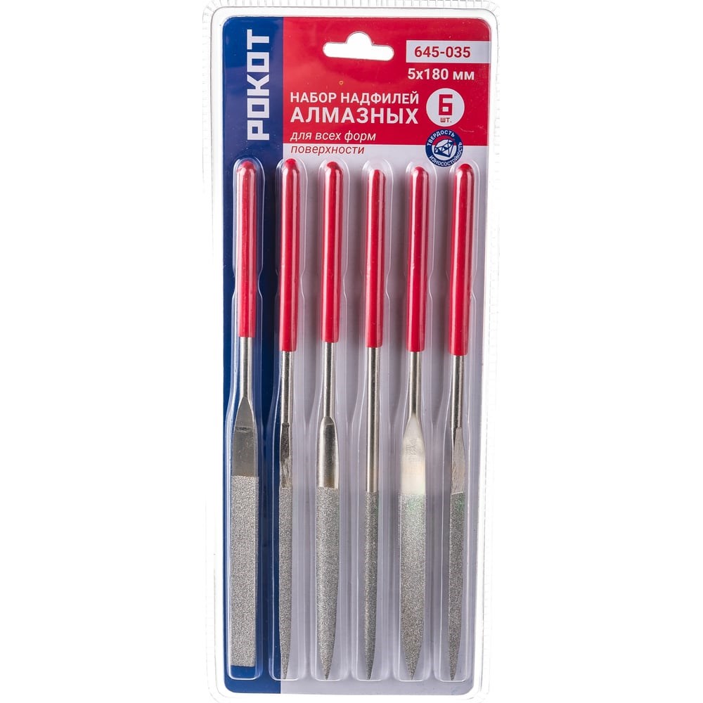 Набор алмазных надфилей РОКОТ 6шт, размер 5x180мм, блистер 645-035 подходит для обработки деталей из различных материалов. Благодаря алмазному напылению эффективно снимает слой со стальных заготовок. Имеется рукоять из ПВХ на каждом надфиле для удобства удержания. Комплект поставляется в полупрозрачном пластиковом конверте.