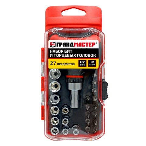 Набор бит и торцевых головок с трещоткой 1/4", 27 предметов, пластиковый бокс, ГРАНДМАСТЕР, 671327