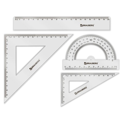 Набор чертежный BRAUBERG (линейка 20 см, 2 треугольника, транспортир), прозрачный, 210853