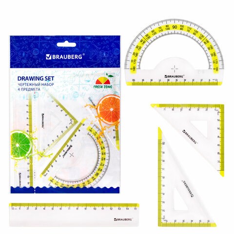 Набор чертежный BRAUBERG "FRESH ZONE" изготовлен из прочного прозрачного пластика со шкалой желтого цвета. Поставляется в пластиковом пакете с европодвесом.