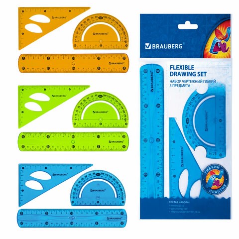 Набор чертежный средний гибкий BRAUBERG "FLEX" (линейка 20 см, треугольник, транспортир), ассорти, 210679