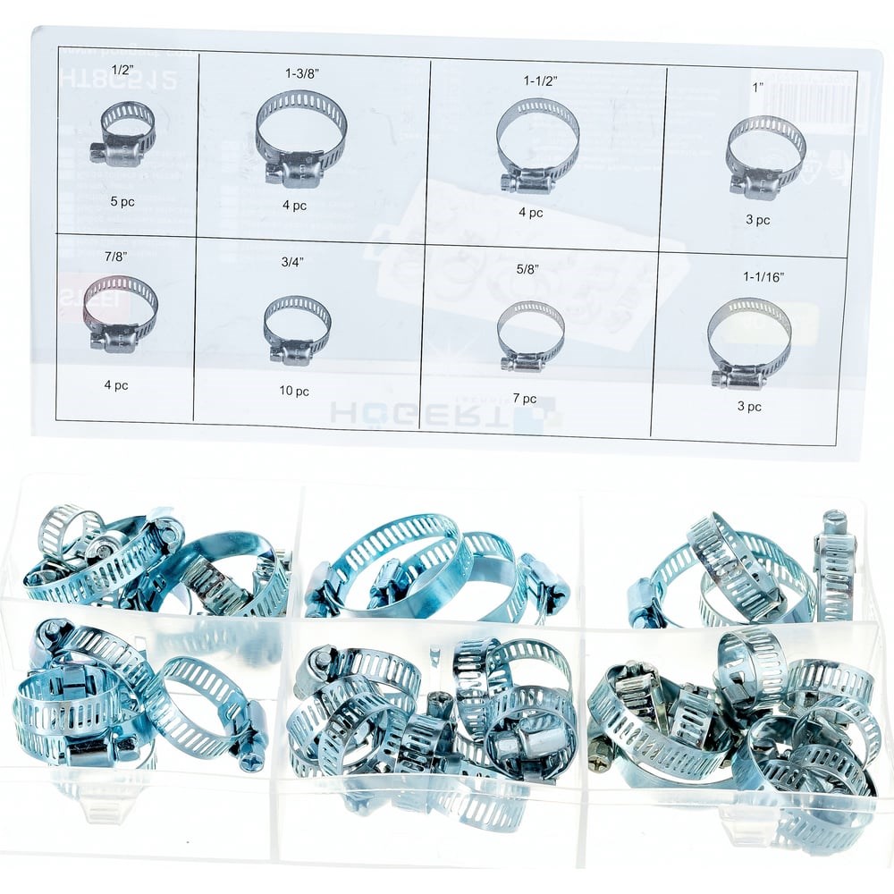Червячные хомуты используются для надёжной фиксации любого шлангового соединения, трубок из резины и ПВХ. Изготовлены из 9 мм оцинкованной стальной ленты. Винты для затяжки с шестигранной головкой. оцинкованная сталь 8 типоразмеров упакованы в пластиковый органайзер с перегородками.