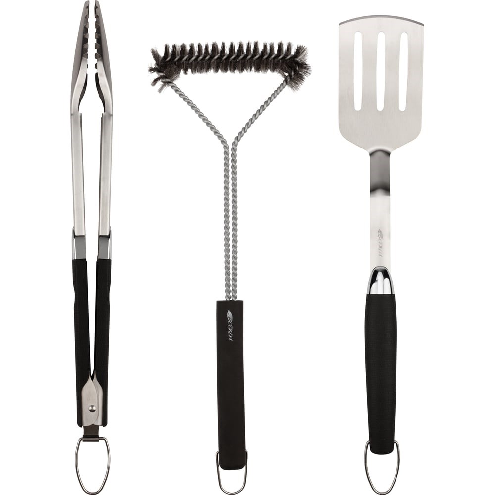 Набор для гриля серии Комфорт состоит из 3-х предметов: щипцов (440x50x1 мм), щетки (430x170) и лопатки (460x90x1.5 мм). Длинные рукоятки аксессуаров из термопластичной резины позволяют перемещать продукты на решетке на безопасном расстоянии от жара, предотвращая ожоги и травмы. Лопаткой можно переворачивать еду, не допуская повреждения структуры продукта и не делая лишних проколов. Рабочая часть лопатки с отверстиями выполняет функцию шумовки – через отверстия происходит отток лишней жидкости (бульона, соуса или масла). Благодаря специальной конструкции щипцы помогают переместить еду, не нарушив ее форму, тем самым сохраняя эстетичный вид для подачи блюда. Жесткая металлическая щетина щетки эффективно удаляет остатки пригоревшей пищи и другие сильные загрязнения. Способна вычищать мелкий сор и грязь даже из труднодоступных мест. Аксессуары выполнены из прочной и экологичной нержавеющей стали, выдерживают большие перепады температур, устойчивы к коррозии.