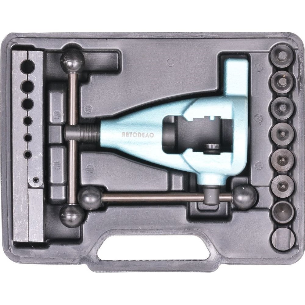 Набор для развальцовки трубок Автоdело двойной конус 4.75-10.0 мм 10 предметов 40435 15896 предназначен для самостоятельного ремонта транспортных средств и применения в быту. За счет расширенного функционала инструмент также используют в центрах технического обслуживания автомобилей. Подходит для работы с трубками диаметром 4,75; 5; 6; 8; 9 и 10 мм. Главные особенности: возможность как односторонней, так и двухсторонней развальцовки трубок из меди, алюминия и стали; в комплекте 10 предметов: винтовой пресс, планка для зажима, сменные пуансоны разного диаметра; углы изделий при развальцовке: 45°, 90°, 180°. При производстве инструмента использована качественная хромованадиевая сталь.