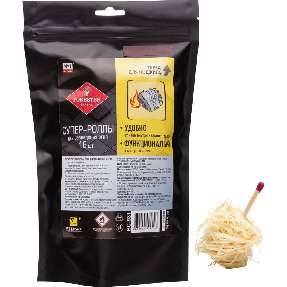 Супер-роллы Forester набор для разведения огня, 16 шт. BC-931 - это экологически чистые деревянные роллы для разведения огня при любой погоде. Помогут вам быстро получить огонь для костра, мангала или барбекю. Тонкие волокна древесины, которые не совсем плотно прилегают друг к другу, загораются сразу же именно благодаря наличию кислорода между древесной стружкой, а гореть один такой ролл может на протяжении пяти минут. Никаких химических добавок, никакого неприятного запаха и моментальный результат - вот, что вы получите, приобщив к своему походному арсеналу древесные роллы для розжига Forester.