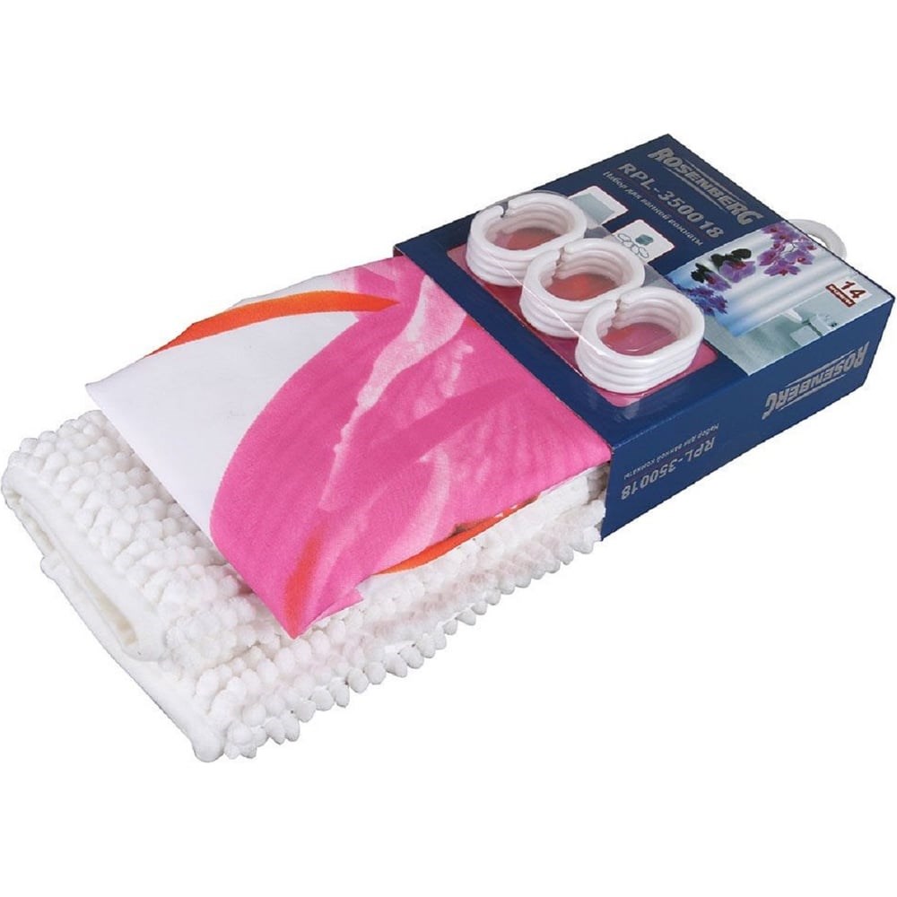 Набор для ванной комнаты: шторка и коврик Rosenberg RPL-350018RPL-350018 дополнительные характеристики: Размер коврика - 40х60 см. Материал коврика - ПВХ. Плотность шторы - 75 г/квм.