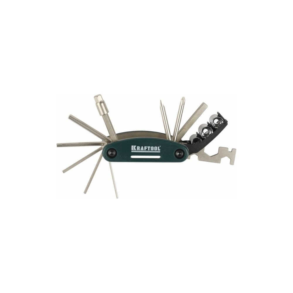 Набор KRAFTOOL для обслуживания велосипеда 16-в-1 26182-H16 - сразу несколько инструментов ремонта и содержания в порядке велосипедной техники. Складной комплект можно легко возить с собой - на всякий случай. В этом наборе вы найдете отвёртки HEX 2; HEX 2,5; HEX 3; HEX 4; HEX5; HEX 6; HEX 8 мм; PH № 2; SL 5 и комбинированные ключи 8; 10; 15 мм; 14 GE, а также адаптер для головок 1/4.