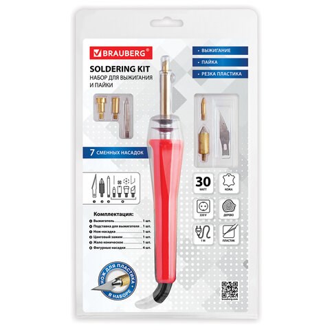 Набор для выжигания и пайки BRAUBERG, 6 насадок + нож для резки пластика, красный, 150621