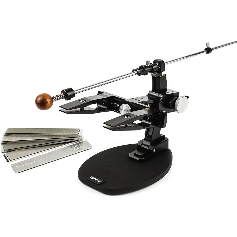Набор для заточки TSPROF Kadet Pro TS-KD22003D предназначен для заточки ножей. Универсальные зажимы позволяют затачивать, как компактные складные ножи, так и солидные охотничьи ножи.Поворотный механизм точилки TSPROF Kadet Pro помогает сохранить одинаковый угол заточки на обеих сторонах ножа. После переворота рычаг намертво фиксирует рамку с зажимами. Вращением ручки подъема, поворотный узел плавно движется вокруг виртуального центра, в котором находится режущая кромка ножа.TSPROF Kadet Pro анодирован в черный цвет по международному стандарту Qualanod. Анодирование применяется для улучшения коррозионной стойкости и укрепления структуры поверхности алюминия. Такой метод покрытия позволяет устройству сохранять идеальный внешний вид долгие годы.В TSPROF Kadet Pro есть всё для самой качественной заточки: механизм поворота ножа, возможность выставить любой угол от 9° до 28,5°, жесткая конструкция и абсолютная точность в каждой детали.Рамка TSPROF Kadet Pro совместима с любыми зажимами от заточной системы Профиль К03: филейными, одиночным, двойным и малым универсальным столиком для заточки инструмента.TSPROF Kadet Pro легко разбирается и складывается для хранения или транспортировки.Характеристики:Толщина ножей в обухе: до 7 мм.Длина лезвия ножа: до 300 мм.Ширина лезвия ножа: до 40 мм.Минимальный угол заточки: 9°.Максимальный угол заточки: 28°.Совместим с абразивами длиной: от 10 до 160 мм.Совместим с абразивами толщиной: от 3 до 15 мм.