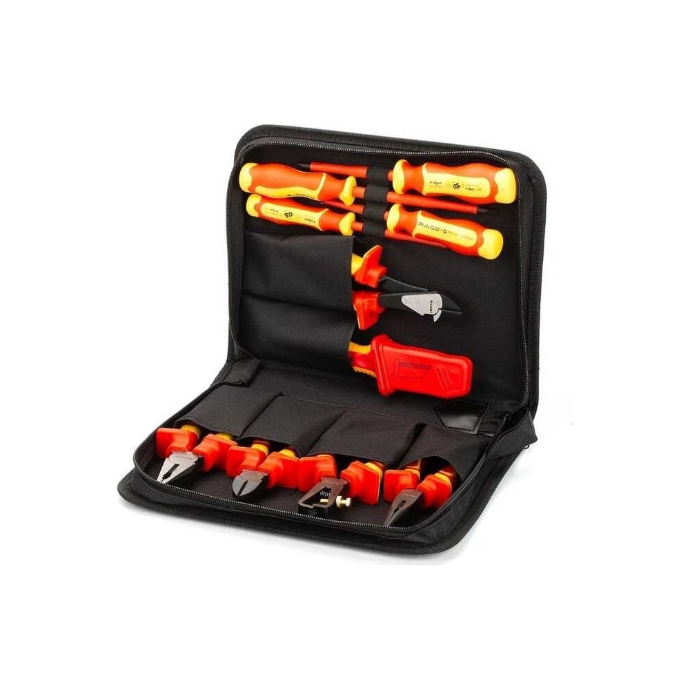 Набор диэлектрического инструмента 10 шт. RAGE by VIRA: Комбинированные плоскогубцы 180 мм (7") Бокорезы 160 мм (6"); Удлиненные бокорезы 180 мм (7"); Клещи для снятия изоляции 160 (6"); Утконосы 160 (6"); Отвертка SL 4 × 100; Отвертка SL 5.5 × 125; Отвертка PH1 × 80; Отвертка PH2 × 100; Нож для снятия изоляции 6". Набор содержит профессиональные инструменты для полного цикла операций профессионального электрика. Комплект поставляется в легком нейлоновом кейсе, в котором удобно хранить и транспортировать инструмент. Диэлектрические ШГИ: сталь CrV60, двухсторонняя полировка, твердость 42-50 HRC Электромонтажные отвертки: сталь S2, магнитный шлиц имеет чернение; Нож для снятия изоляции: сталь 7CR15; Рукоятки: TPE; Max напряжение: 1000V; СЕРТИФИКАТЫ: VDE: 40023902; VDE: 40025771; VDE: 40054105; СТАНДАРТЫ: IEC 60900, АС 1000V. Набор сертифицирован немецкими стандартами качества VDE и GS. Знак VDE (Verband Deutscher Elektrotechniker) – является документальным подтверждением безопасности электроинструмента. Обратите внимание: Обязательно проверяйте подлинность сертификатов перед покупкой на оф. сайте vde.com. Номер сертификата должен быть указан на этикетке товара. Широкий выбор ручных инструментов для любых целей RAGE by VIRA - доверьтесь качеству: RAGE не подведет!