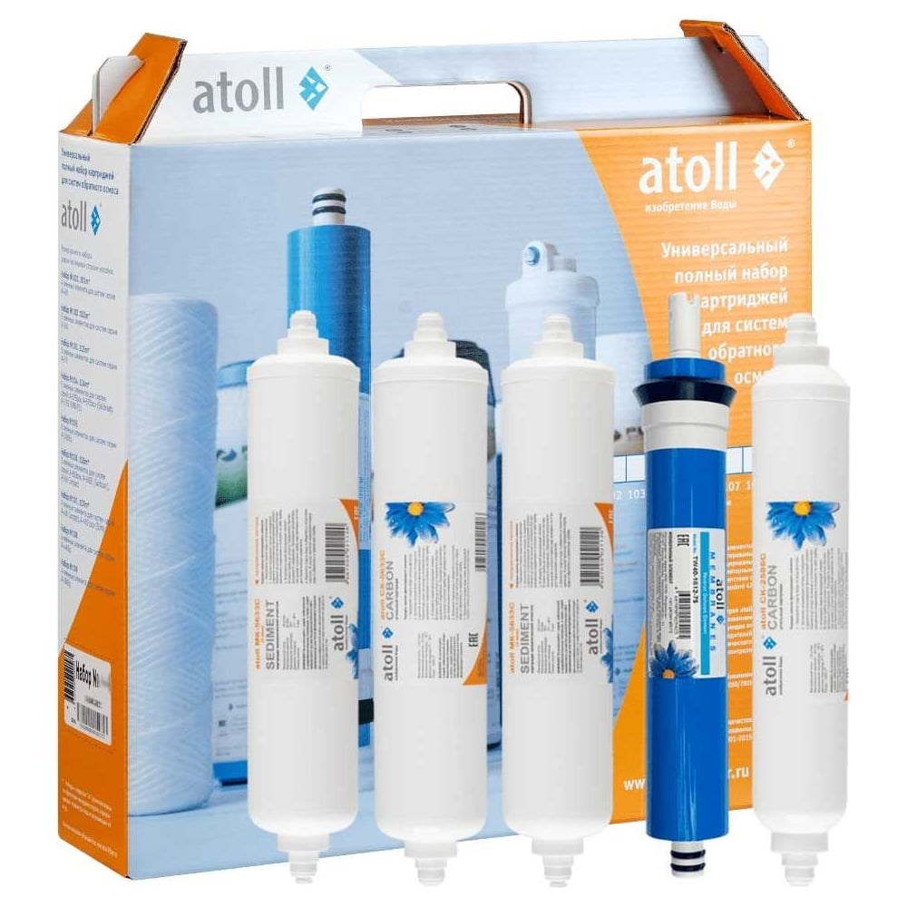 Набор картриджей atoll №104 STDA – это полный комплект сменных элементов для систем обратного осмоса atoll Sailboat A-575 STDA и Sailboat A-575p STDA, а также для более старых моделей A-575 box и A-575 CMB-R3 и их модификаций с повысительным насосом.В состав Набора №104 STDA входят фильтрующие элементы:– префильтр механической очистки atoll MK-5633C 5 мкм;– угольный префильтр atoll СK-5633C;– префильтр тонкой механической очистки atoll MK-5633C 1 мкм;– обратноосмотическая мембрана atoll TW40-1812-75 производительностью 75 галлонов в сутки (75 GPD);– угольный постфильтр atoll СK-5633C.