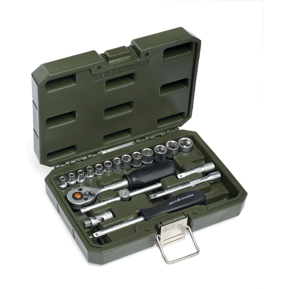 Набор шестигранных головок с трещоткой 1/4 19 предметов ДТ/20 Дело Техники 600719 предназначен для монтажа и демонтажа резьбовых и торцевых соединений. Рабочая часть инструментов изготовлена из хромванадиевой стали, которая обладает повышенной твердостью, благодаря процессу холодной ковки, которому она была подвергнута. Пластиковый кейс необходим для бережного и аккуратного хранения и транспортировки приспособлений. Трещотка с квадратом 1/4".