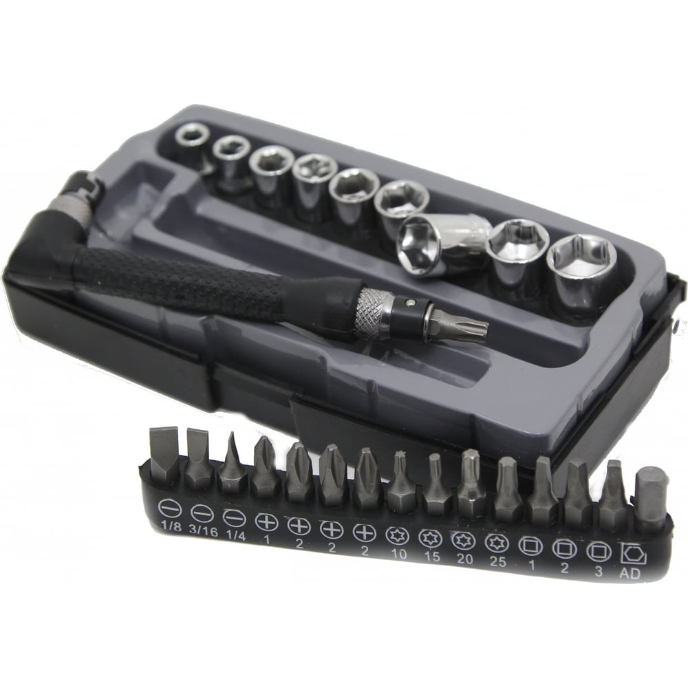 Набор головок и бит 26 шт KROFT Набор состоит из бит 25 мм с шестигранным хвостовиком1/4'' HEХ,торцевых головок высотой 20 мм со стандартным рабочим профилем 1/4, адаптером и угловой рукояткой. Набор охватывает наиболее полный и востребованный комплект бит и головок, применяемых в быту. Угловая рукоятка позволяет производить работы в труднодоступных местах, в то время как адаптер для бит делает замену и установку быстрой и легкой для пользователя. Специальные пластиковые держатели позволяют удобно хранить головки и биты. Шестигранный хвостовик 1/4'' бит и переходника для торцевых головок позволяет ихиспользовать не только с ручным инструментом, но и электроинструментом рассчитанным на хвостовиктипа HEX. Все инструменты изготовлены из высокопрочной инструментальной стали CS которая обладает отличными свойствами, такими как жесткость, прочность, устойчивость к износу и коррозии. Это делает набор пригодным как в бытовом, так и в профессиональном использовании. Характеристики:Длина биты (мм): 25Тип хвостовика: 1/4'' HEXДлина головки (мм): 20Рабочий профиль: 1/4Материал: инструментальная сталь (CS)Количество предметов в упаковке (шт): 26Состав набора:Рукоятка для бит (угловая) х 1 шт,Адаптер х 1 шт,Торцевая головка (1/4") х 9 шт: 5, 6, 7, 8, 9, 10, 11, 12, 13 мм,Бита (25 мм) х 15 шт: PH0 (3 мм), PH1 (4.5/4 мм), PH2 (6 мм), PH3 (8 мм), PZ0 (3 мм), PZ1 (4.5/4 мм), PZ2 (6 мм), PZ3 (8 мм), SL3, SL4, T10, T15, T20, T25, T30