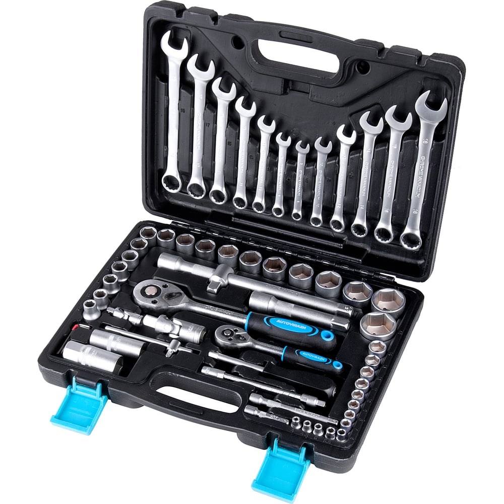 Набор инструмента AUTOVIRAZH 61 предмет, 1/2" 1/4"DR AV-212061 используется во время проведения ремонтных или слесарно-монтажных работ. Комплектация набора 61 предмет состоит из торцевых головок 1/4" и 1/2" с приводами и аксессуарами, комбинированных ключей с наиболее распространенными профилями и типоразмерами. Эргономичные рукояти приспособлений обеспечивают надежный захват без проскальзывания. Благодаря прочному пластиковому кейсу инструмент удобно хранить и транспортировать.