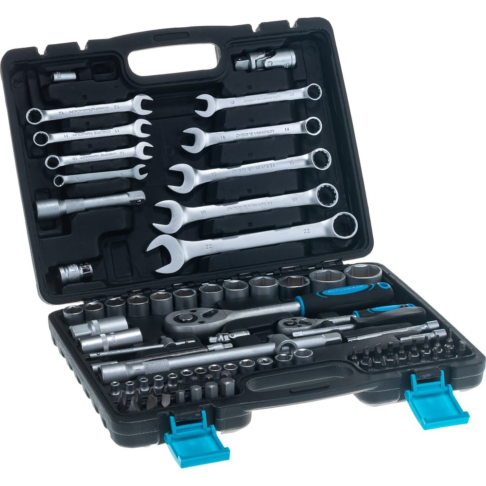 Набор инструмента 82 предмета 1/2" 1/4"DR, CrV AUTOVIRAZH AV-212082 используется во время проведения ремонтных или слесарно-монтажных работ. Комплектация набора 82 предмета состоит из торцевых головок 1/4" и 1/2" с приводами и аксессуарами, комбинированных ключей, а так же бит и головок со вставками с наиболее распространенными профилями и типоразмерами. Эргономичные рукояти приспособлений обеспечивают надежный захват без проскальзывания. Благодаря прочному пластиковому кейсу инструмент удобно хранить и транспортировать.