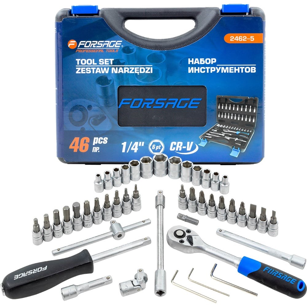 Набор инструментов Forsage из 46 предметов на посадочный квадрат 1/4", 6-граней. Он разработан для того, чтобы упростить монтажные и ремонтные работы в автомобиле, велосипеде, мотоцикле или мопеде.Повышенная прочность и устойчивость к коррозии: Инструменты изготовлены из хромованадиевой стали, что обеспечивает им повышенную прочность и устойчивость к коррозии.Надежность и долговечность: Надежность и долговечность каждого предмета набора позволят вам с легкостью выполнять обслуживание и ремонт вашего автотранспорта.Универсальность: Комплектация включает в себя торцевые 6-гранные головки различных размеров, трещотку, Т-образный вороток, кардан, удлинители, гибкий удлинитель, шестигранные ключи, отвертку под биты, адаптер-переходник, головки-биты различных типов (HEX, TORX, SL, крестообразные PH, крестовые PZ).Удобство хранения и транспортировки: Все инструменты хранятся в удобном пластиковом кейсе, который защищает инструменты от повреждений и удобен для транспортировки.Компактность: Набор инструментов Forsage — это надежный и компактный помощник для всех видов ремонтных работ, который всегда будет под рукой в случае неожиданных ситуаций на дороге или в гараже.