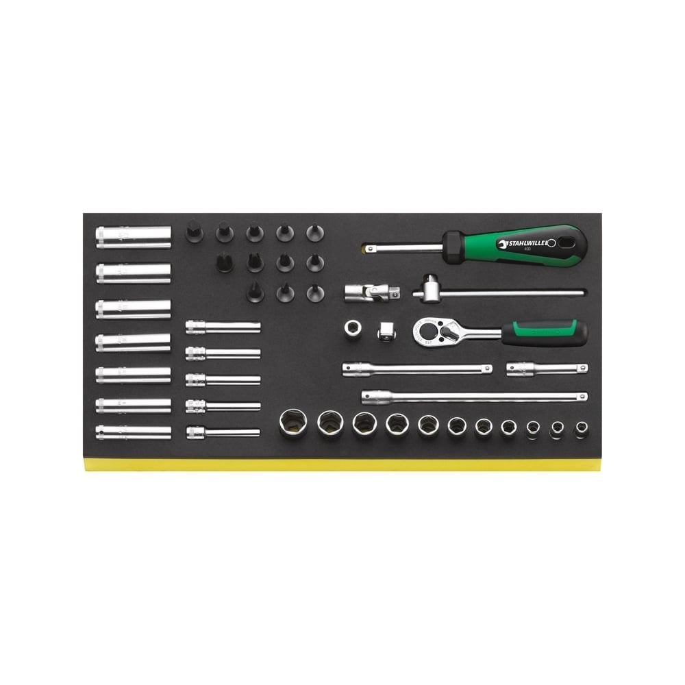 Набор инструмента Stahlwille 1/4" В0000000063433 используется при ремонтных и монтажных работах для откручивания и закручивания резьбового крепежа. В комплекте поставляются переходники и удлинители, которые позволяют выполнять задачи в условиях ограниченного пространства. Инструменты прошли закалку в масляной ванне для того, чтобы рабочие поверхности плотно прилегали друг к другу, что исключает срыв и повреждение граней крепежа. Поставляется во вкладыше TCS. Набор выполнен из легированной стали для долгого срока службы.