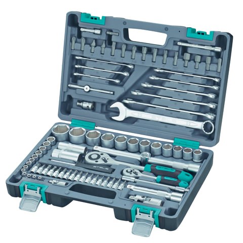 Комплект состоит из 82 предметов. Головки и комбинированные ключи изготовлены из хромованадиевой стали, придающей инструменту исключительную твердость в сочетании с легкостью. Биты, биты-вставки и отвёртки производятся из стали S2, улучшающей свойства инструмента. Все наборы упакованы в кейс, изготовленный из жесткого противоударного пластика, с металлическими застёжками. На все наборы инструментов STELS предоставляется пожизненная гарантия (подробнее об условиях гарантии можно узнать из гарантийного талона).