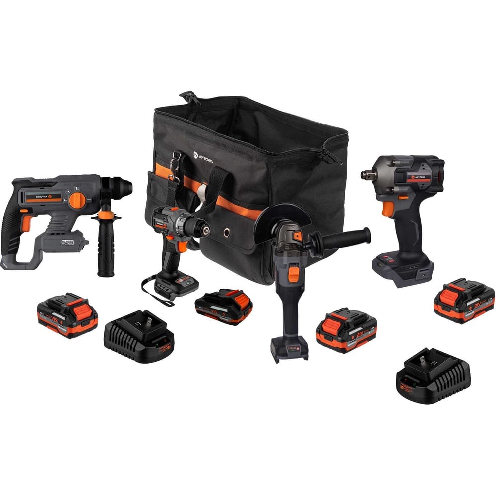 КомплектацияУдарная дрель-шуруповерт 50 Н.м., гайковерт 380 Н.м., УШМ, перфоратор