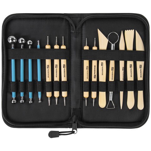 В набор входит 14 инструментов для лепки, самых разнообразных по форме и размеру, из дерева и металла.
